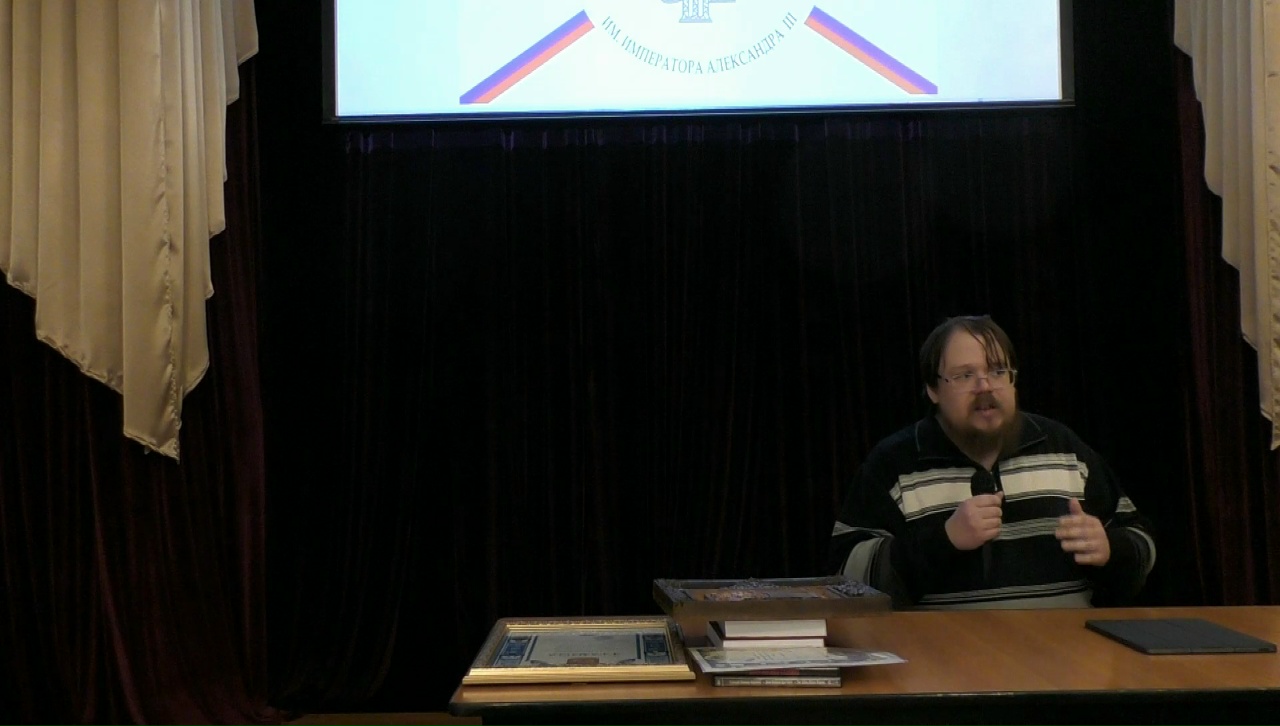 Не успел представить свой доклад профессор Виталий Юрьевич Даренский, задержавшийся на собрании общества ревнителей памяти Императора Николая Второго. Профессор Аркадий Юрьевич Минаков представил своё выступление в формате видеозаписи.