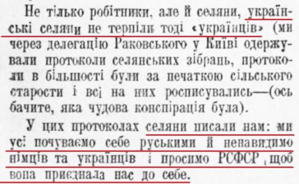 Не только рабочіе, но и крестьяне, украинскіе крестьяне не терпѣли тогда «украинцевъ» (мы черезъ делегацію Раковскаго въ Кіевѣ получали протоколы крестьянскихъ собраній, протоколы въ большинствѣ были съ печатью сельскаго старосты и всѣ на нихъ расписывались — вотъ видите, какая чудесная конспирація была).