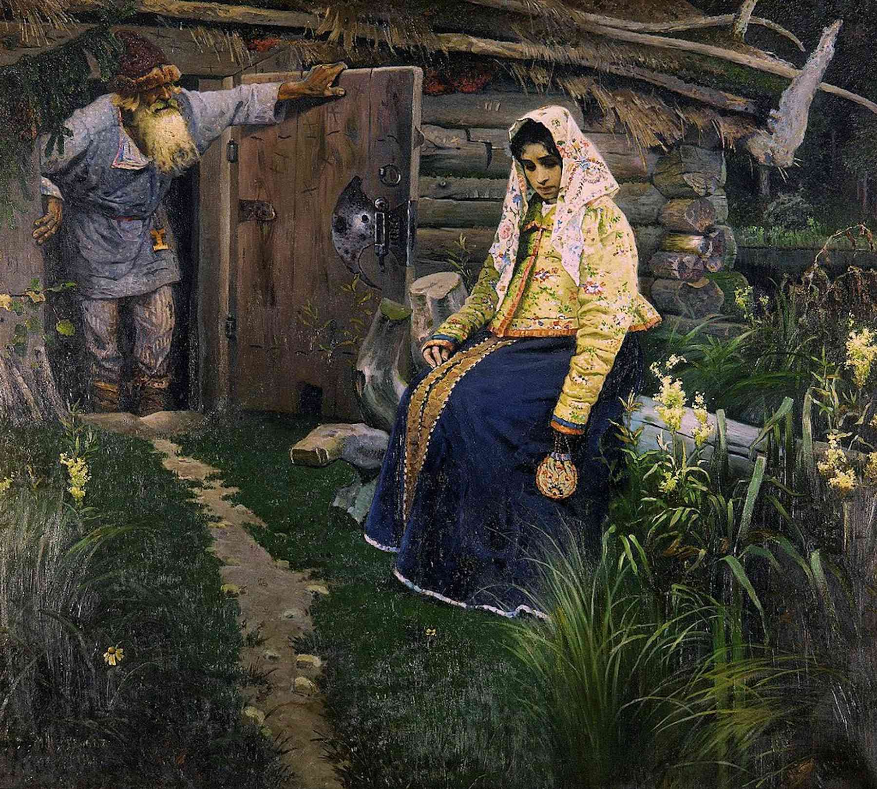 - Ну-ка, гости мои незваные, присаживайтесь-ко на скамейки-то... отдышитесь маленько-то... Я кваску холодненького с погребца принесу кувшинчик... А ты, барынька, видишь тамочко в углу ведро, так водицей-то зеньки ребяток ополосни... пыль-то лесную смой... Вот тебе рушник - оботрёшь им опосля... Здеся же в кувшине водица-то питьевая... Напой ребяток-то - вот кружка...
